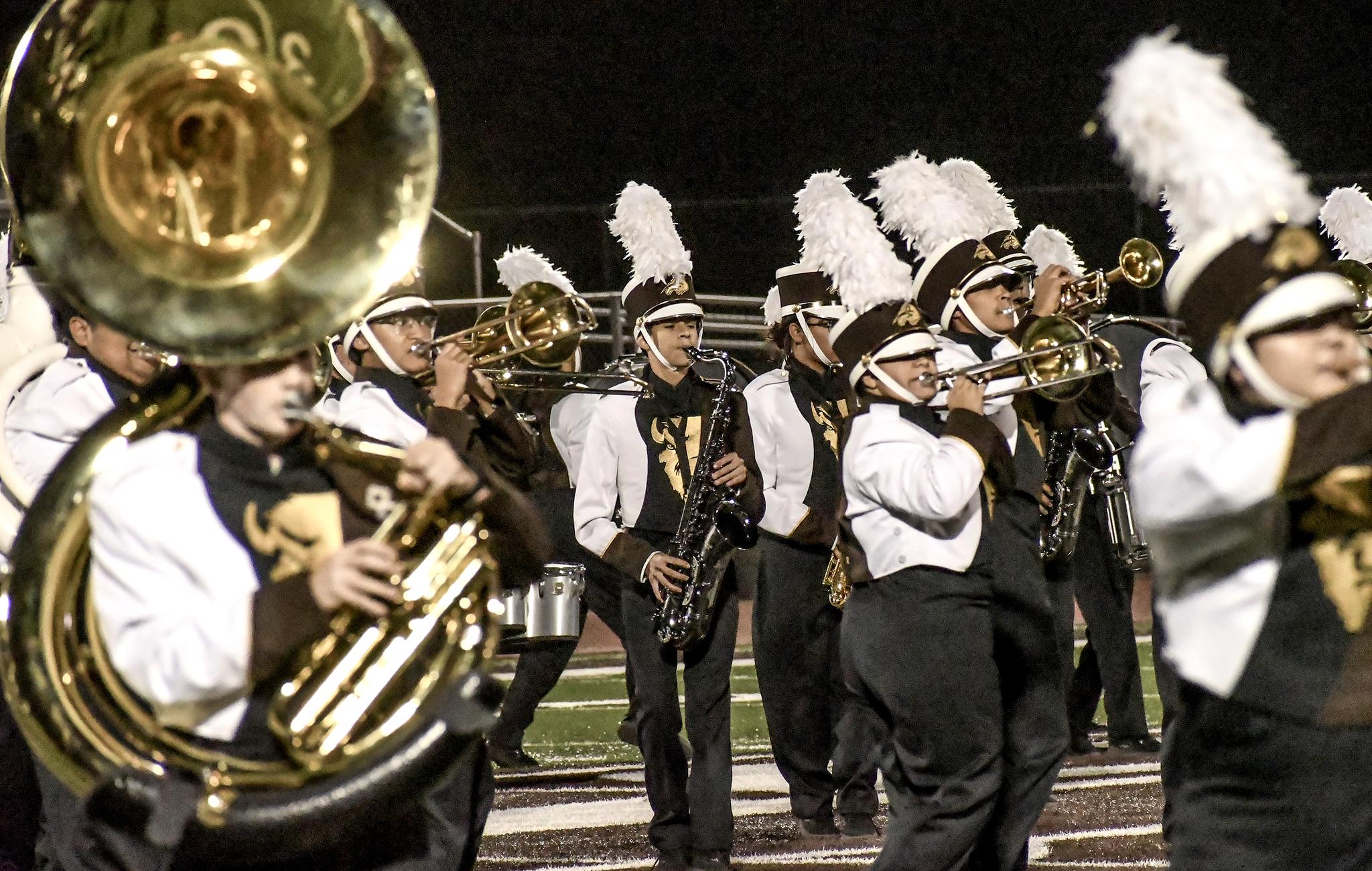 Garden City High School’s Marching Stampede band members maneuver around the field as they perform their “Outlaw Wanted: Out West Wanted Conflict” show Tuesday night at Buffalo Stadium during the Western Athletic Conference’s Marching Band Festival. The band received a superior rating, the top rating level, for their production. Also participating in the festival were…