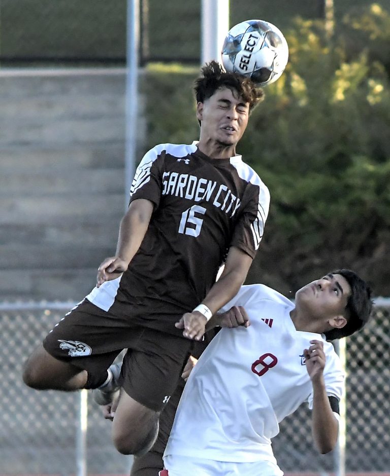 Garden City Community College’s Jose Navarro, right, battles for control of the ball with an Otero, Colo., player Saturday during a scrimmage at Broncbuster Stadium.…
