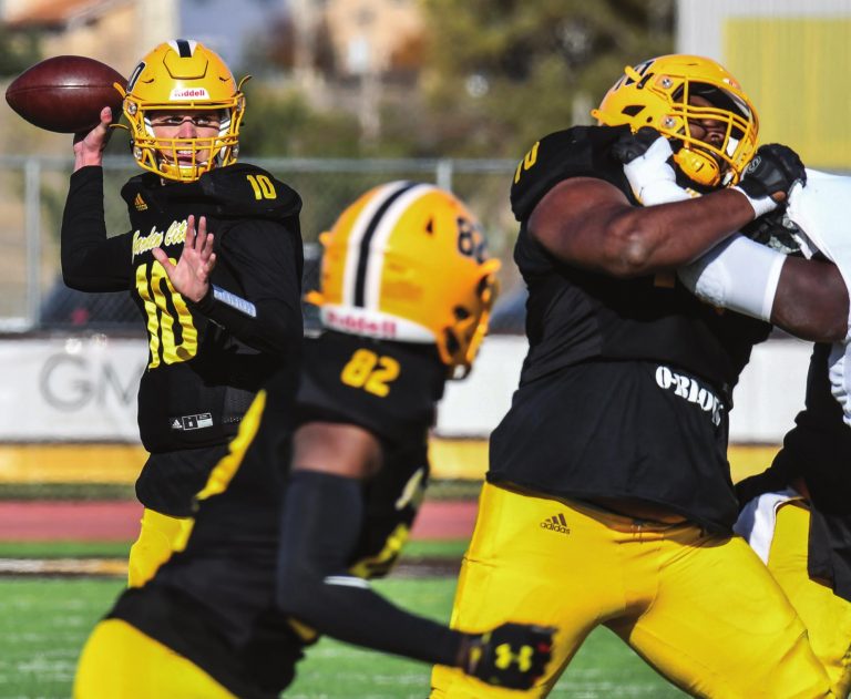 Garden City Community College quarterback Rhett Ricedorff, left, readies to throw a pass in November against Butler at Broncbuster Stadium. BRAD NADING/GARDEN CITY TELEGRAM