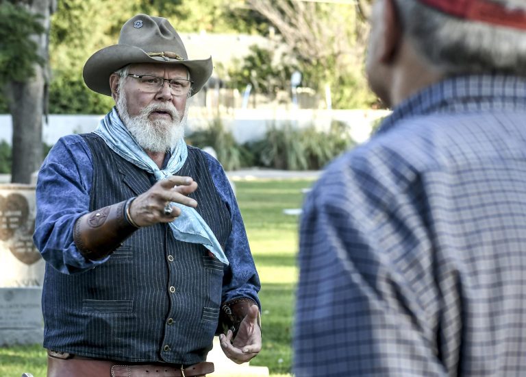 Reenactor Larry Cole, portraying Buffalo Jones, talks about bringing buffalo back to Kansas to tour patrons Friday during one of the stops in a Finney County Historical Society’s Historic Walking Tours of Valley View Cemetery. BRAD NADING/GARDEN CITY TELEGRAM