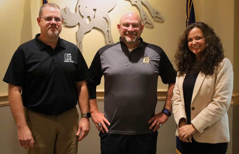 From left, Chuck Pfeifer, GCCC Dean of Technical Education and Workforce Development; Scott Kedrowski, GCCC Dean of Advancement and Alumni Relations; and Ruth Dickson, Patterson Family Foundation Director of Communications, pose for a photo during a meeting about the Construction and Electrical Technology Center. COURTESY GCCC