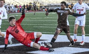 Garden City Community College’s Vitoria Reis bumps the ball to make a save as it heads out of bounds Oct. 22 during a volleyball match…