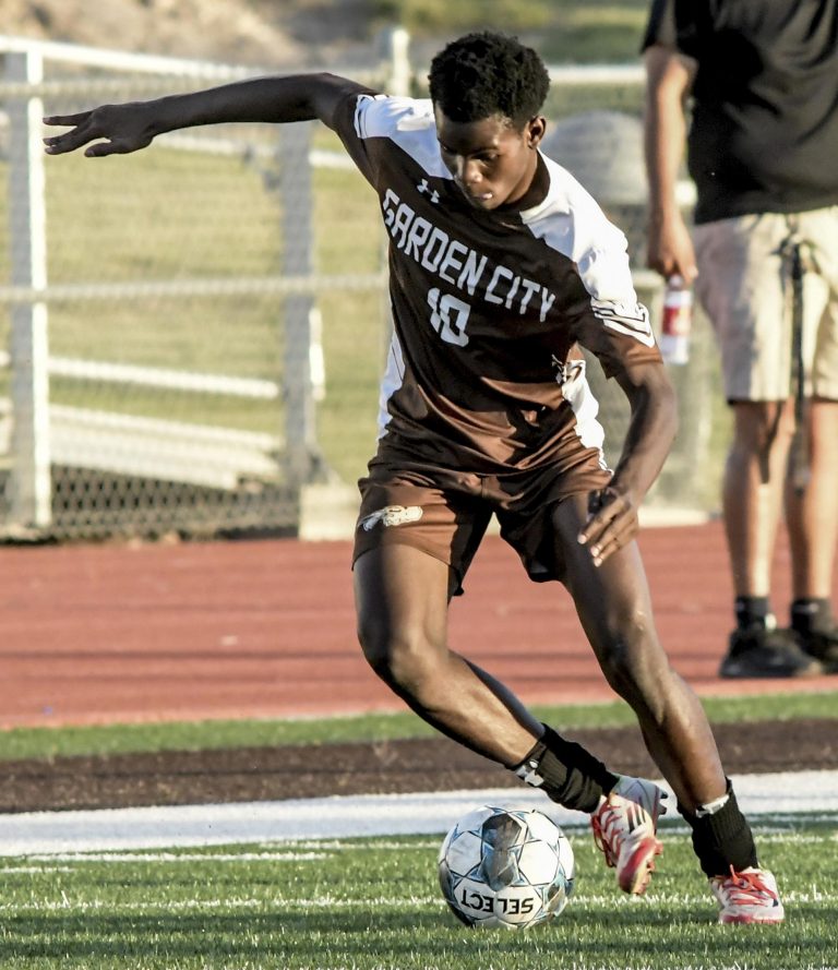 Garden City High School defenders Cylis Saldana, left, Jonathan Baires, right, and Johnny Garza, bottom. drop Liberal’s Eathan Hernandez for a loss on a play Friday during a WAC match up at Buffalo Stadium. BRAD NADING/GARDEN CITY TELEGRAM